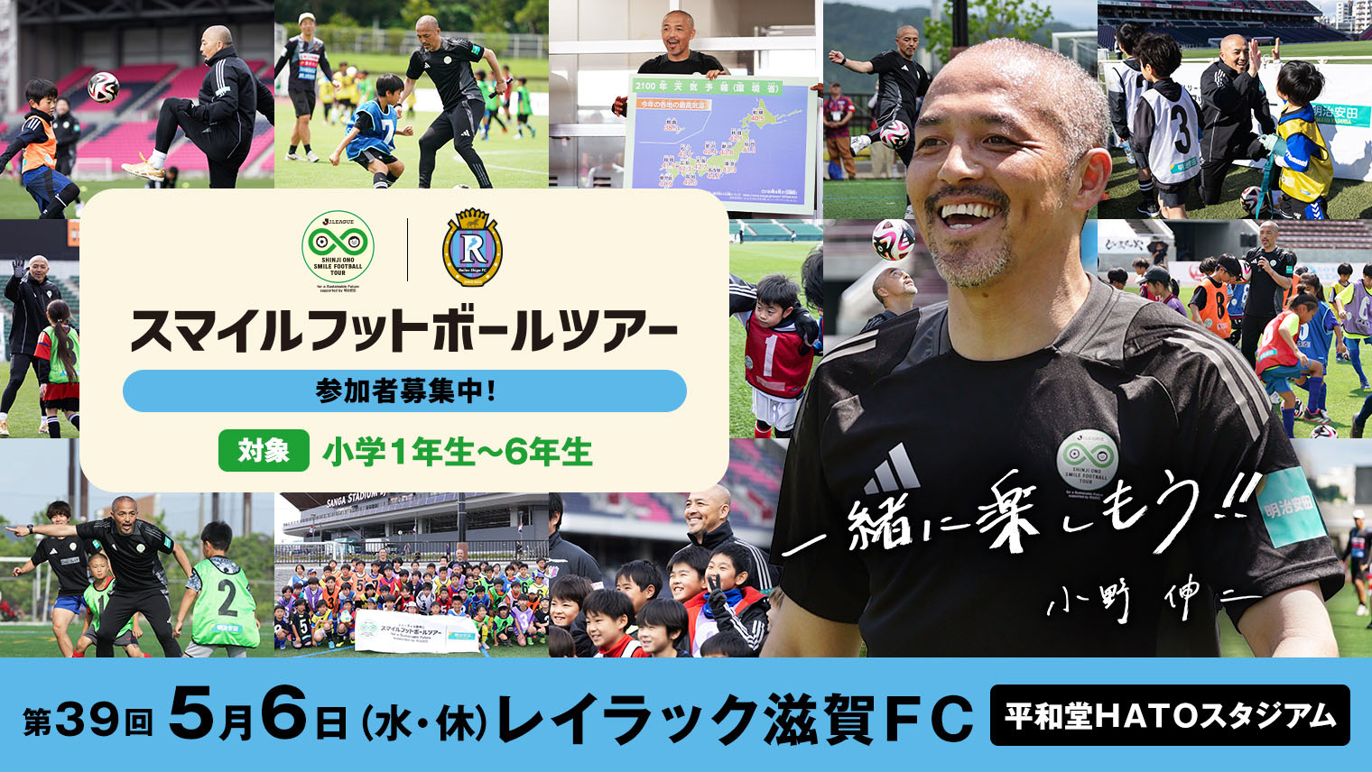 5月6日(水・休) に開催される明治安田J2・J3百年構想リーグ 第15節 レイラック滋賀FC vs レノファ山口FC(14:00キックオフ/平和堂HATOスタジアム)の試合前に、Jリーグによる、小学生の子どもたちを対象とした「サッカー教室」と「サステナトーク」を行う『Jリーグ×小野伸二 スマイルフットボールツアーfor a Sustainable Future supported by 明治安田』が開催されることとなり、参加者の募集を開始しましたのでお知らせいたします。
