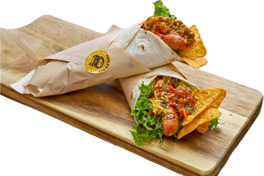 タコスメインのお料理。DORIINCOS / HARLY'S ROLL / NANDOG / タコライス / 近江牛すじガーリックライス / 近江牛すじカレー / cafe latte jelly・waffle / バナナジュース